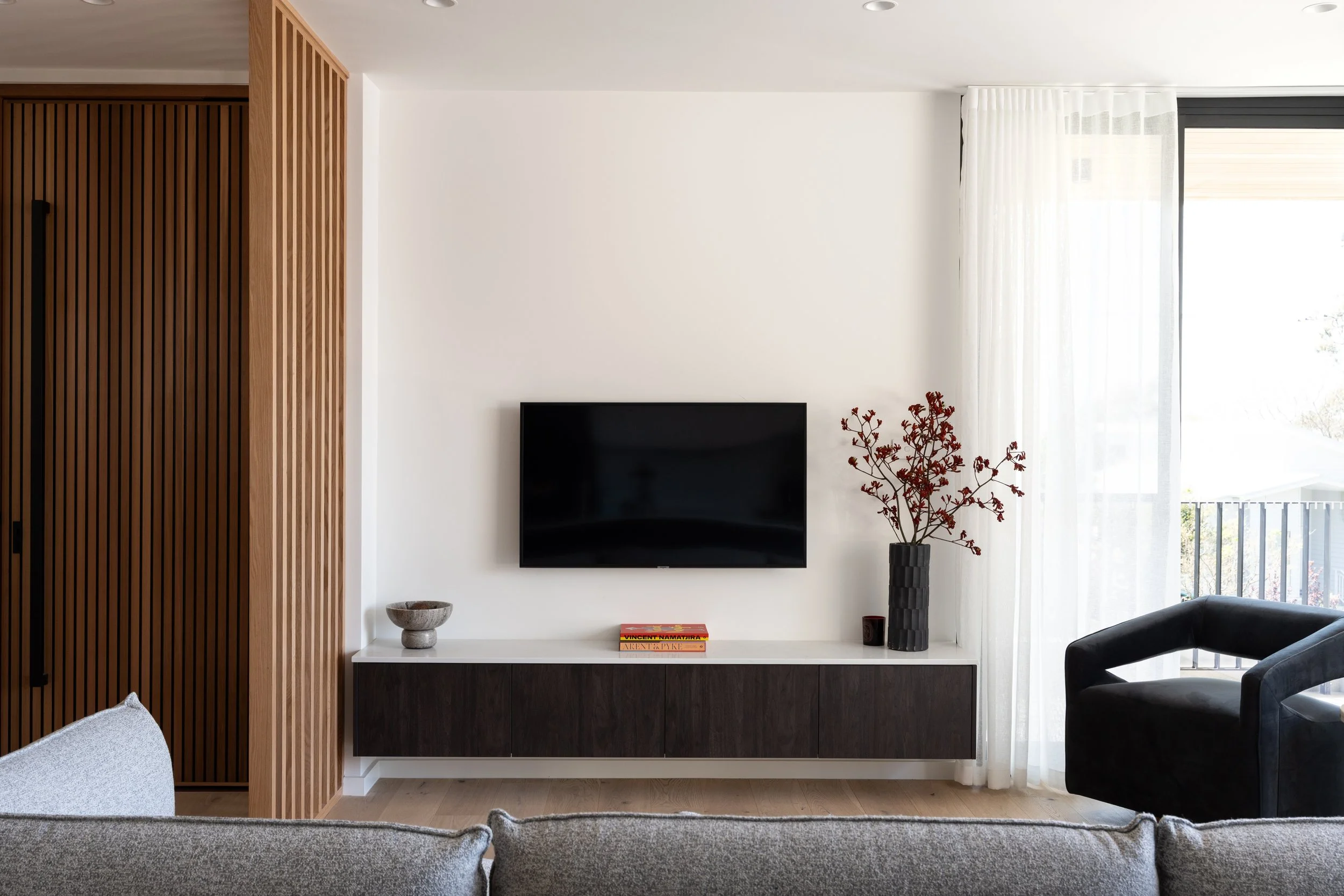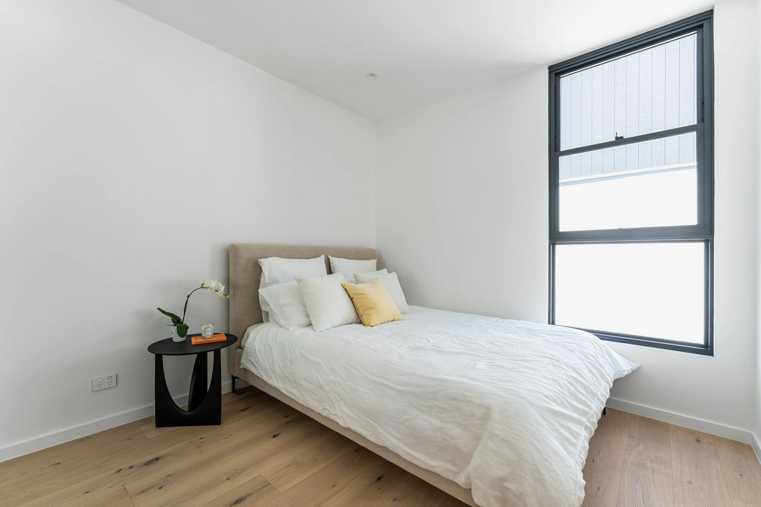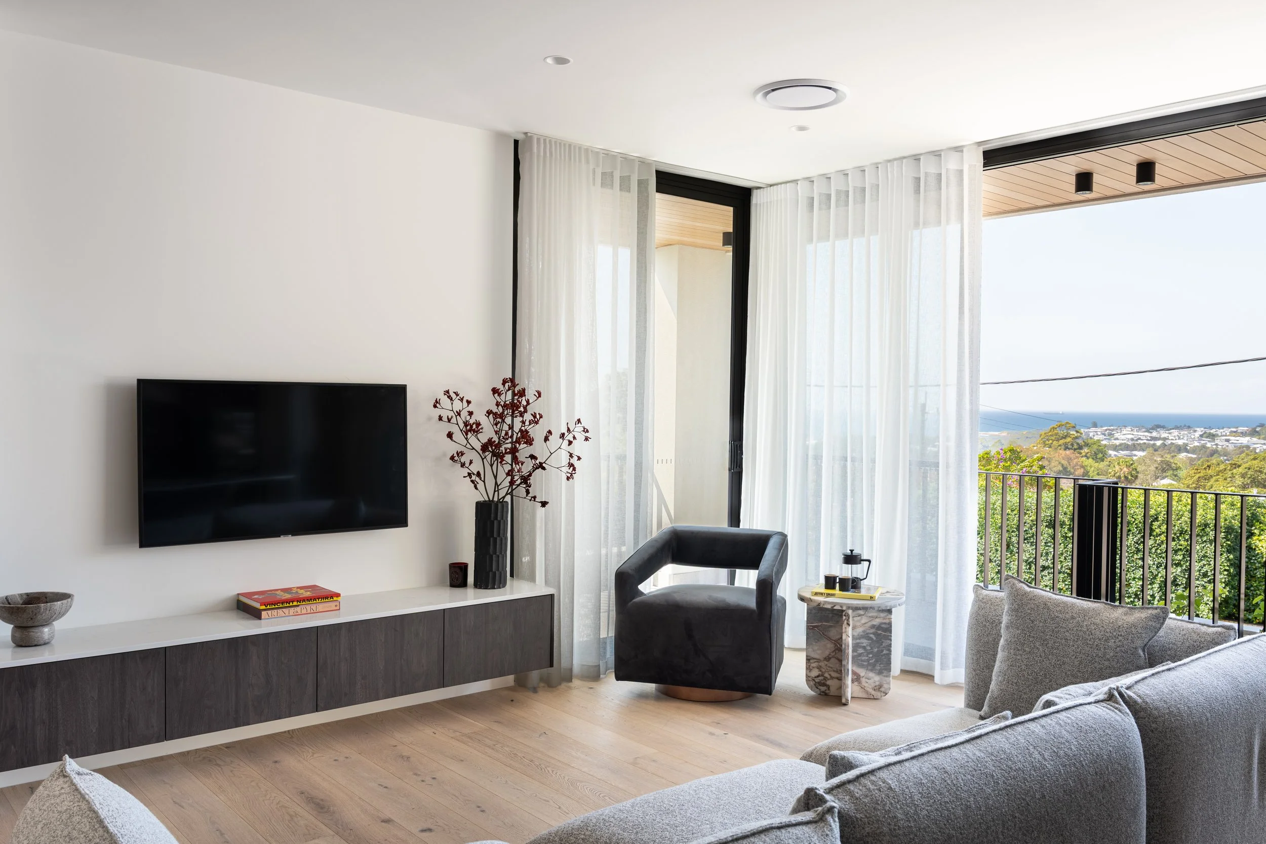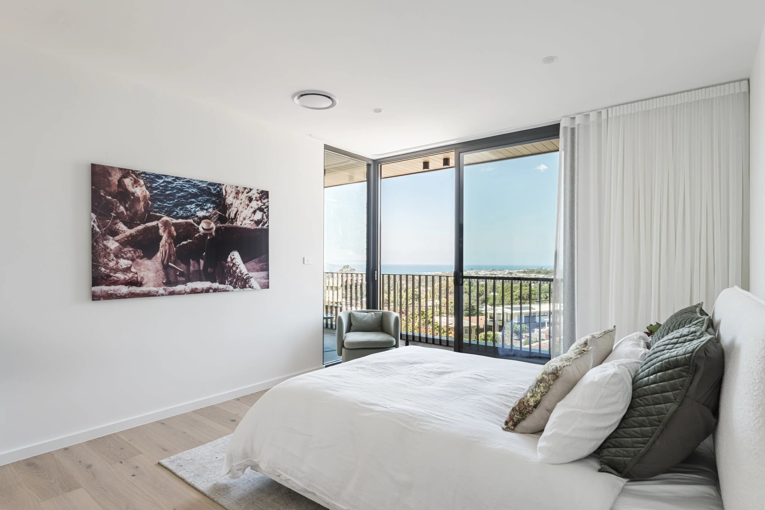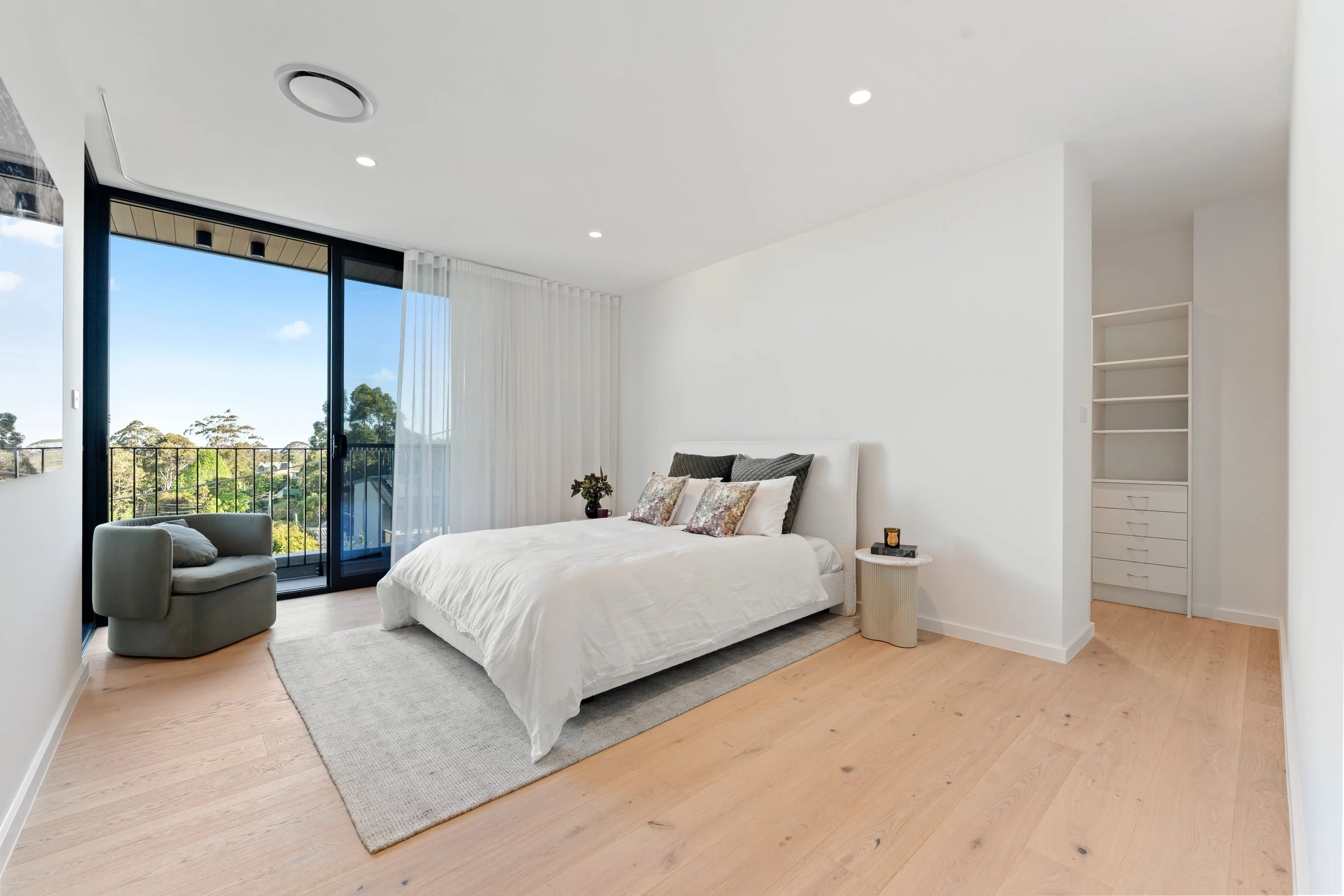 • Premium finishes include warm engineered oak flooring and bespoke designer sheer curtains that soften interiors with refined elegance. The home also features ducted climate control for year-round ease, heated flooring & heated vertical towel racks in bathrooms/master ensuite for added luxury, and solar power for sustainability.